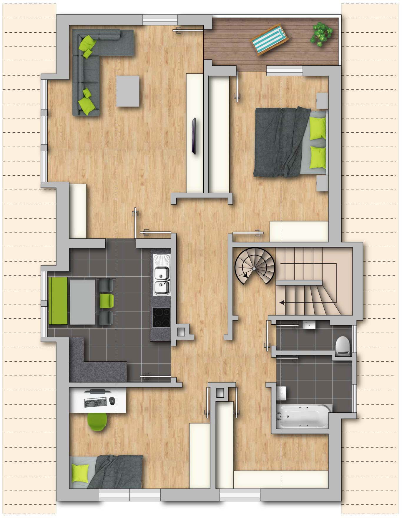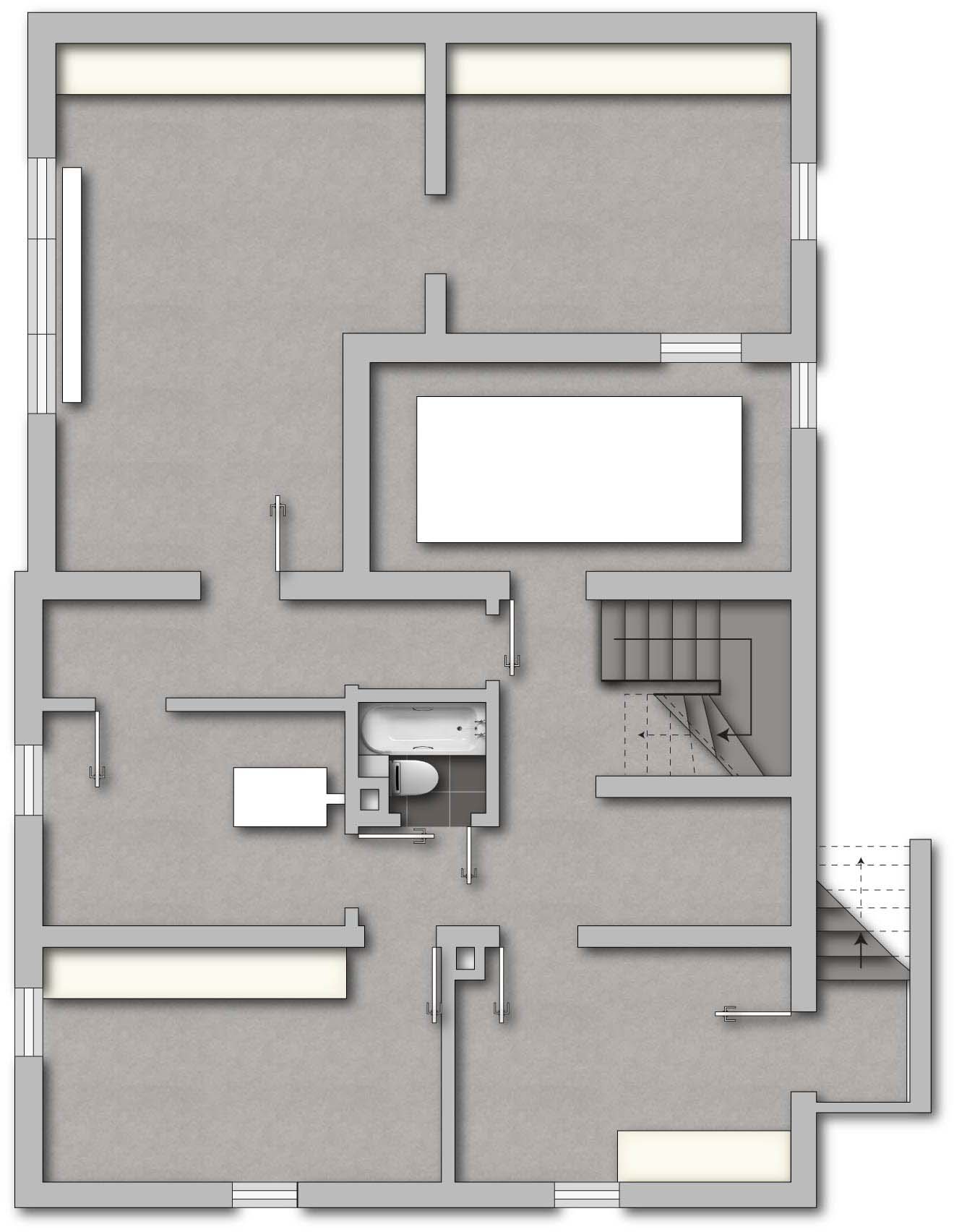 Zusätzlich ausgebauten Raum gibt es im Spitzboden, der über eine Wendeltreppe über das Treppenhaus erreichbar ist.
