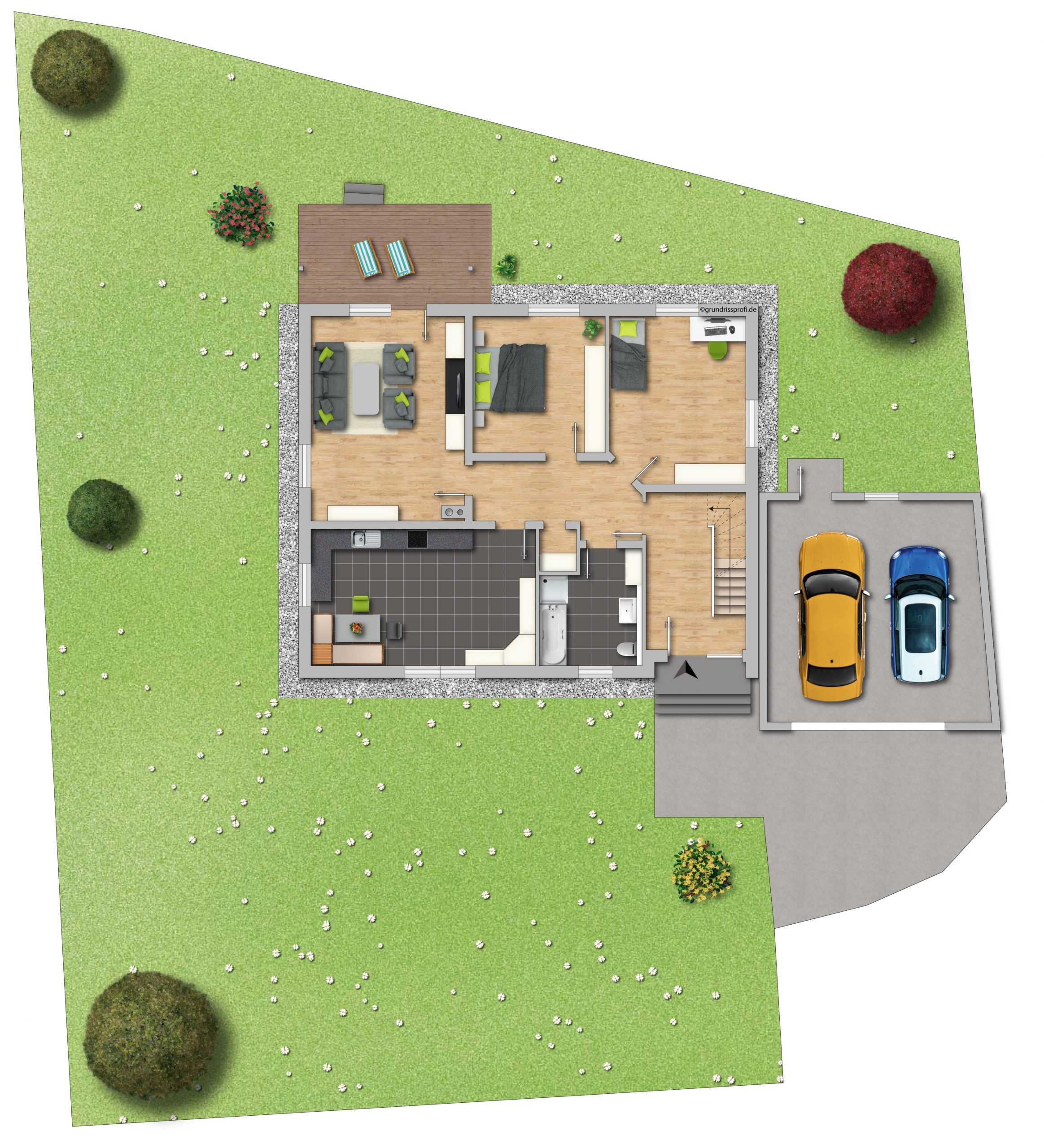 Die Wohnung im Erdgeschoss gewährt dabei ein großzügiges Wohnen und Leben auf einer Ebene. Wohnen und Wohnküche sind äußerst großzügig geschnitten und punkten durch den Tageslichtfaktor. Eine geschützte Terrasse grenzt direkt an und bietet entspannende Stunden an sonnigen Tagen.