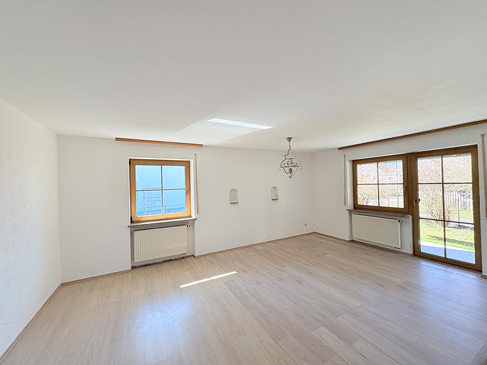 Gemütlich im Obergeschoss ist die Wohnung wunderbar ausgebaut. Hier sind Wohnen und Essen offen geschnitten. Ein großer sonniger Balkon ist hier angeschlossen. Die Küche erlaubt ebenfalls Platz für einen Essbereich.