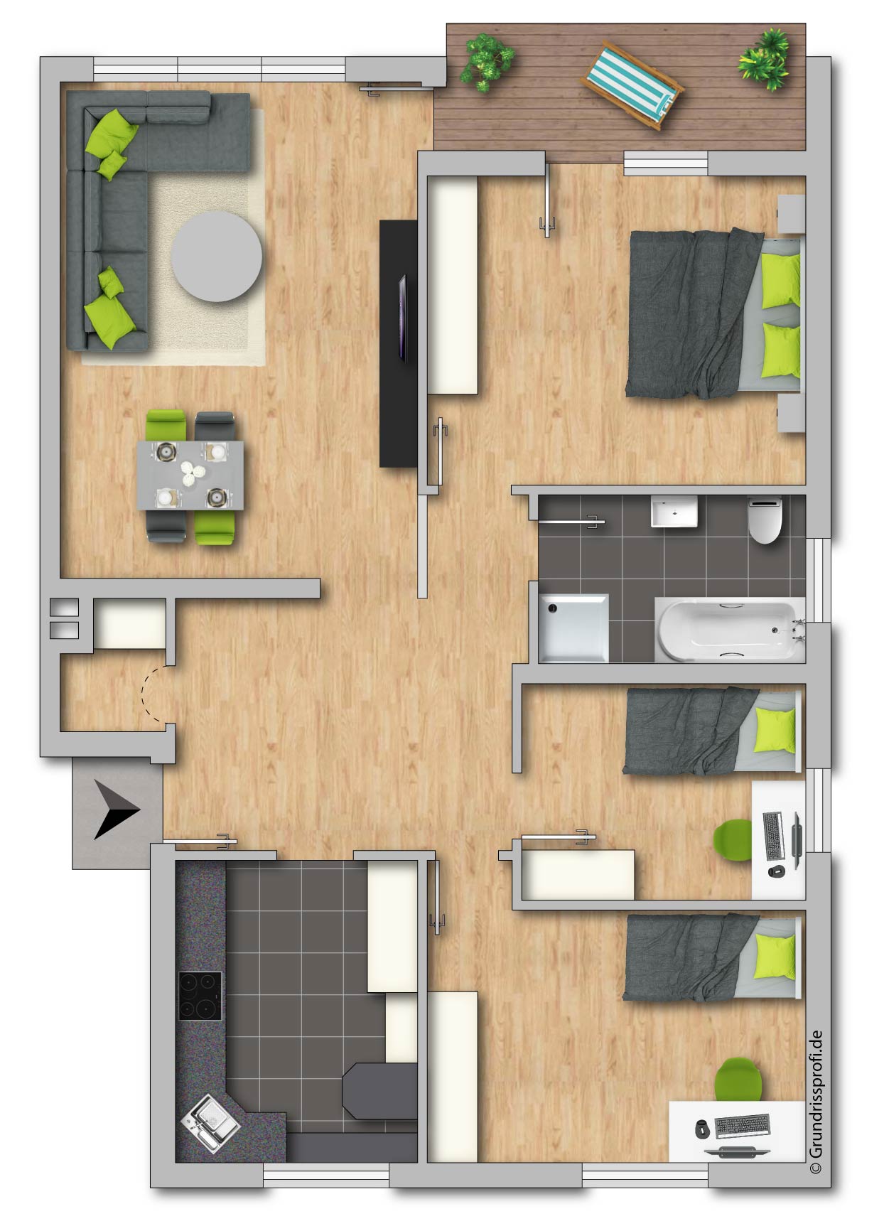 Zwei weitere Räume finden sich im Anschluss, die perfekt als Kinder- oder Arbeitszimmer genutzt werden können. Das Schlafzimmer ist gut geschnitten und bietet ebenfalls wie das Wohnen den Zugang zum Balkon.